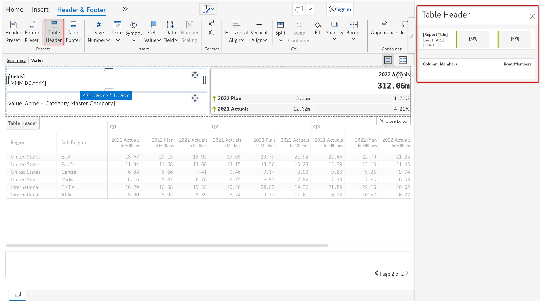 a) As you hover over the header, you can see two context menus. One is for the report header and the other is for the table header.