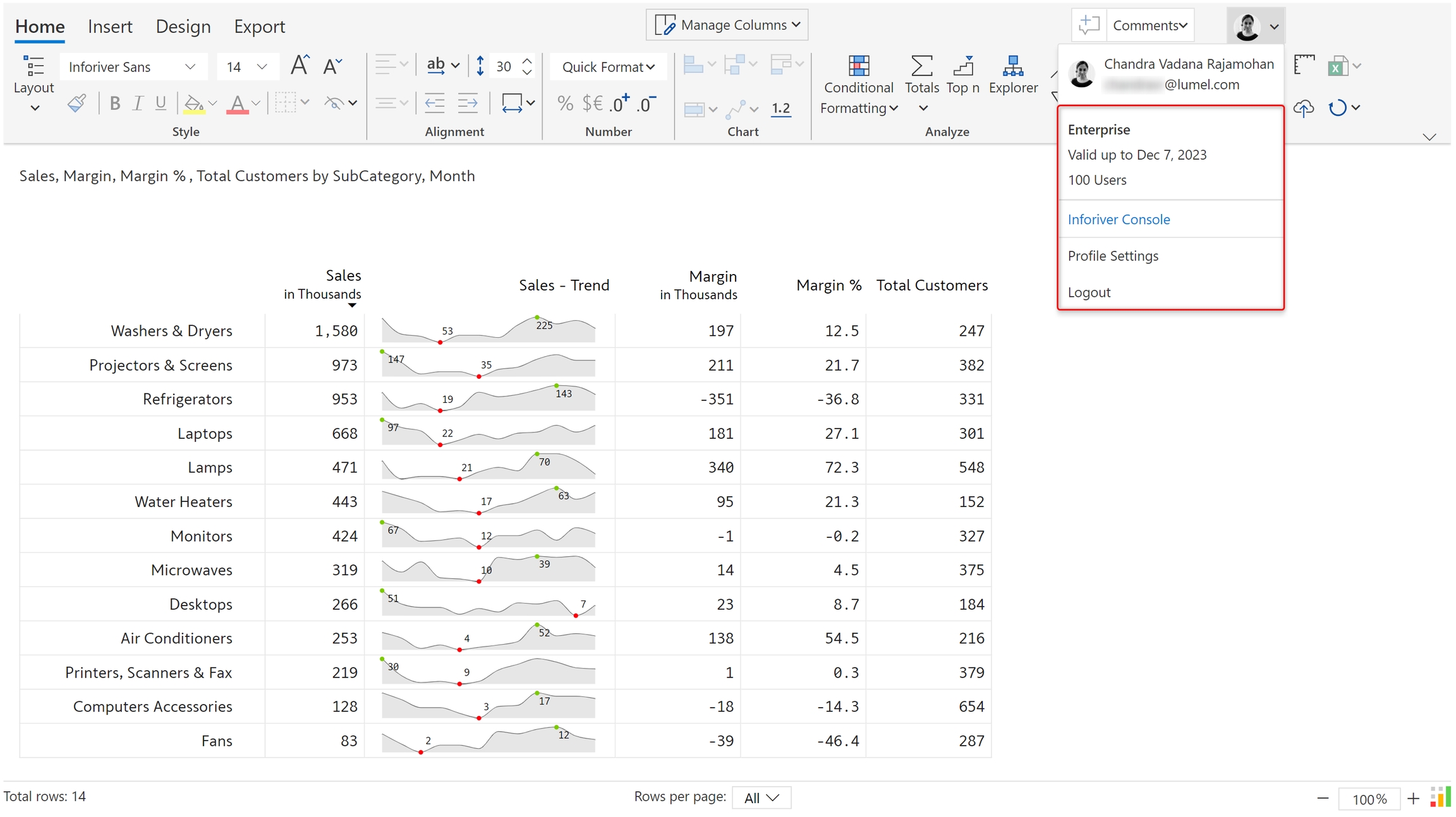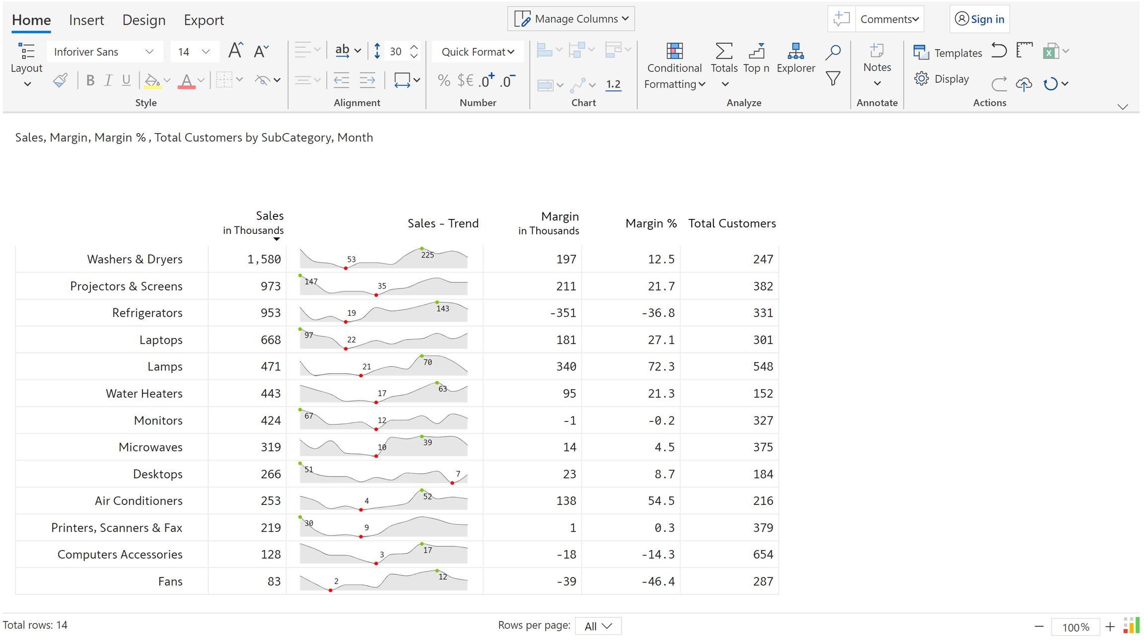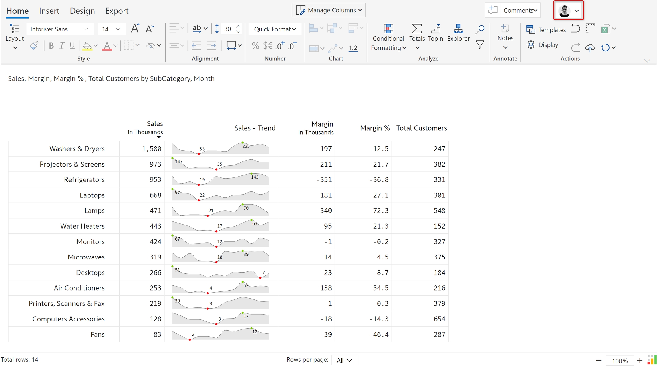 The below image shows a sales report - monthly sales trend for product subcategories, margins, and total customers. Let's see how to add data-level comments and facilitate conversations with your peers directly from within your Power BI report.