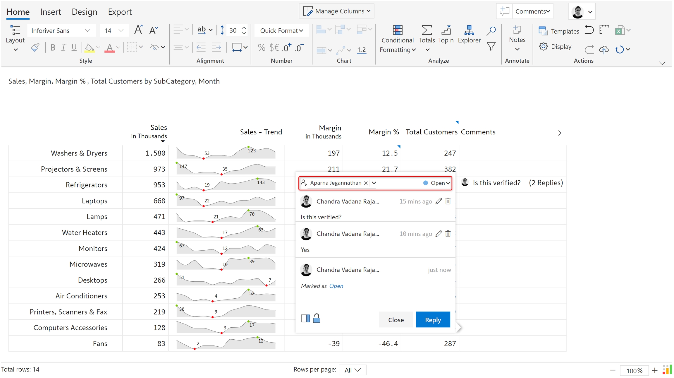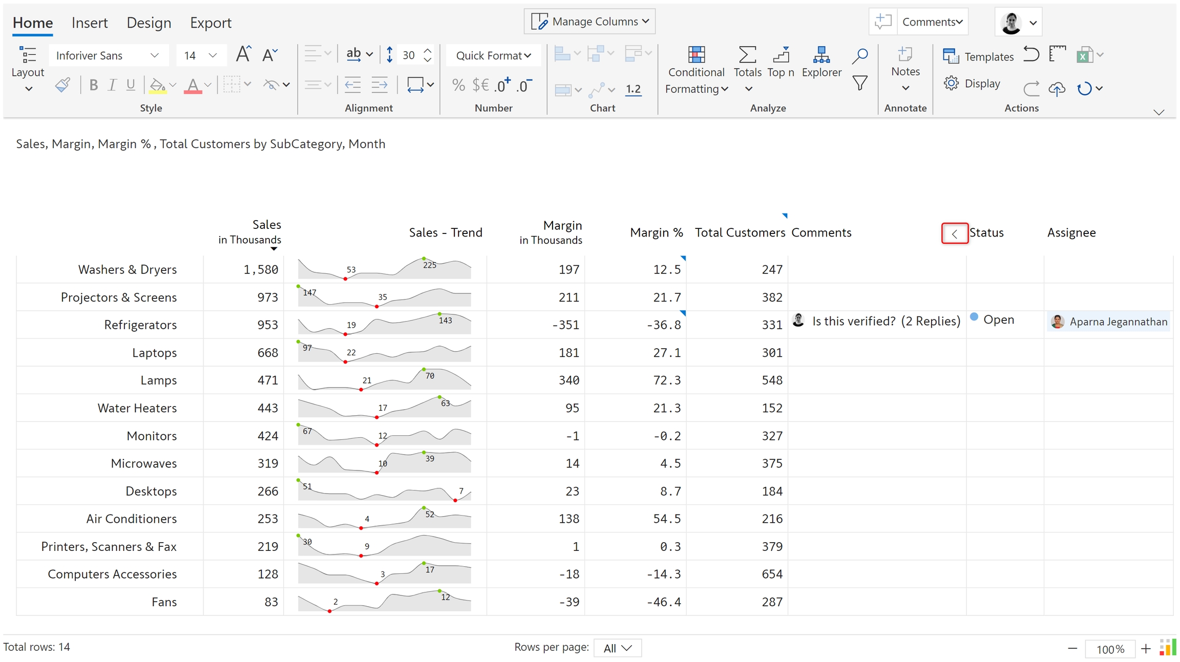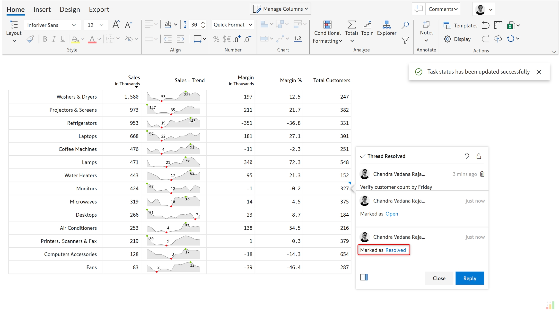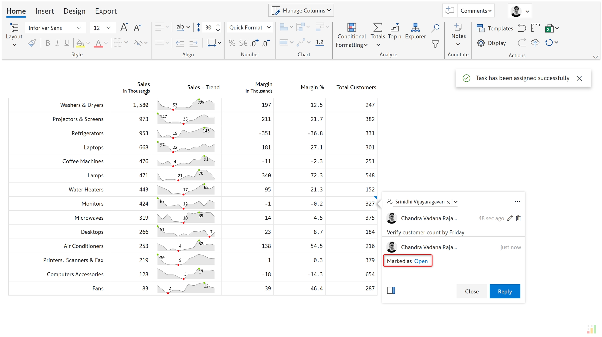 e) By clicking on the arrow highlighted, you can expand/collapse the task status and assignee columns. Based on the selection in the comments editor, these columns get populated automatically.