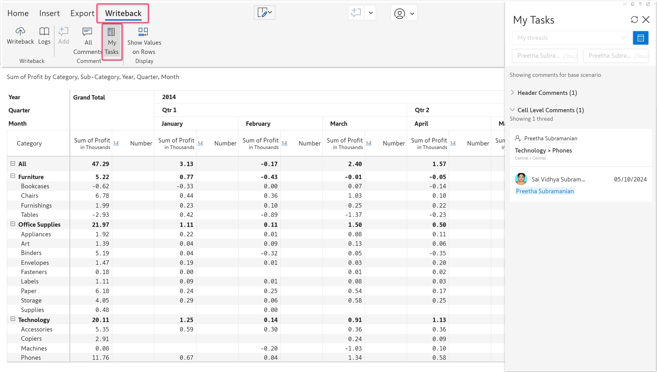 e) Users who only consume the report in the reading view and do not have edit access can also see their assigned tasks. In the Writeback tab, click on My Tasks. A side panel opens showing the list of tasks assigned to you.