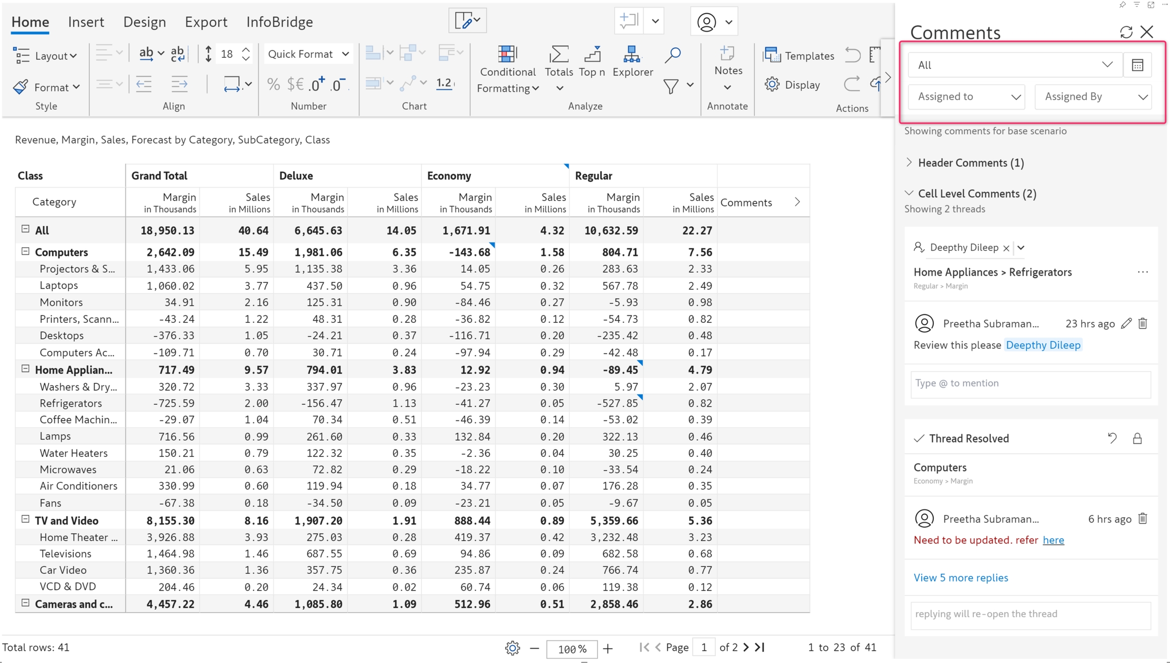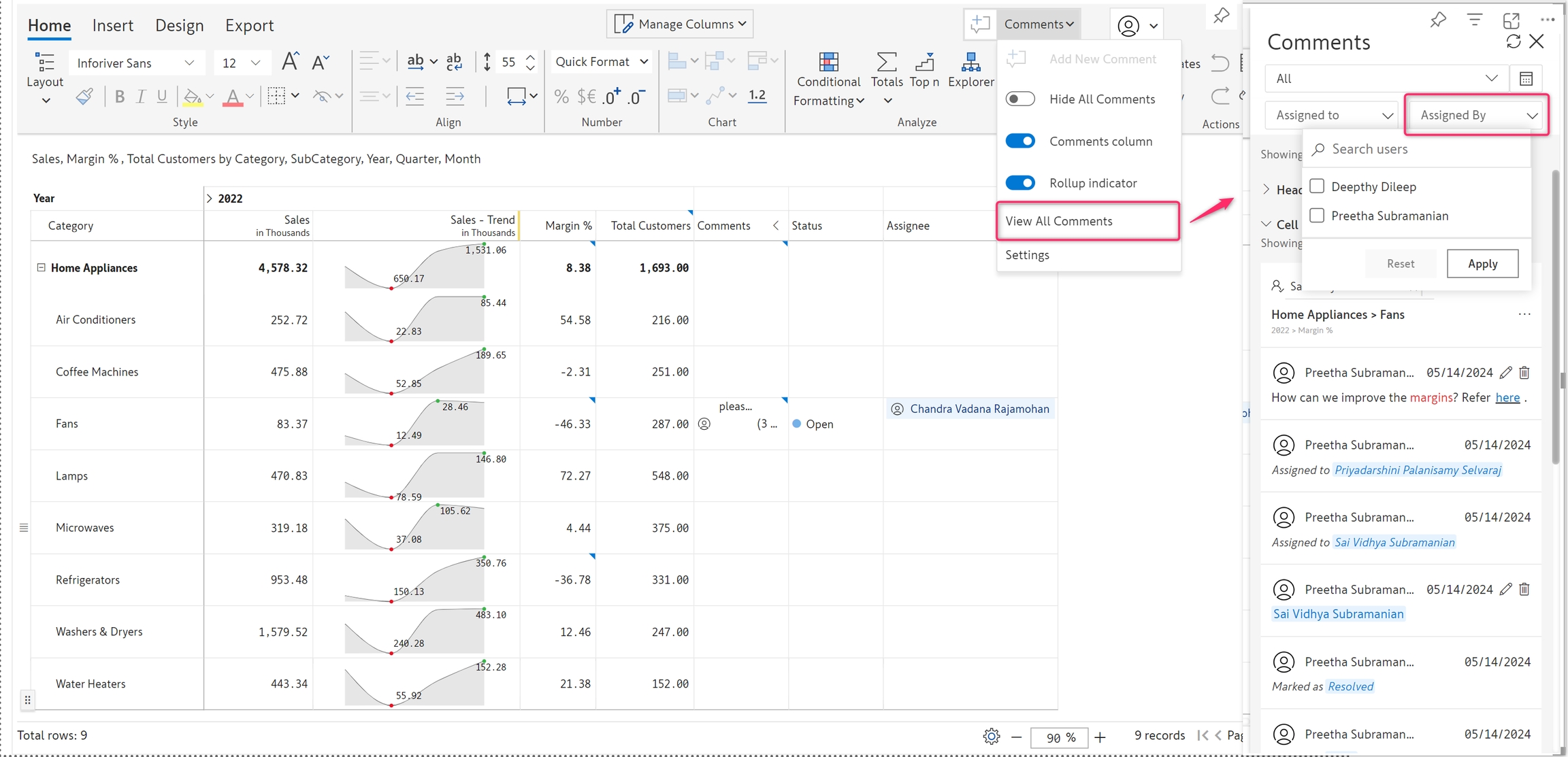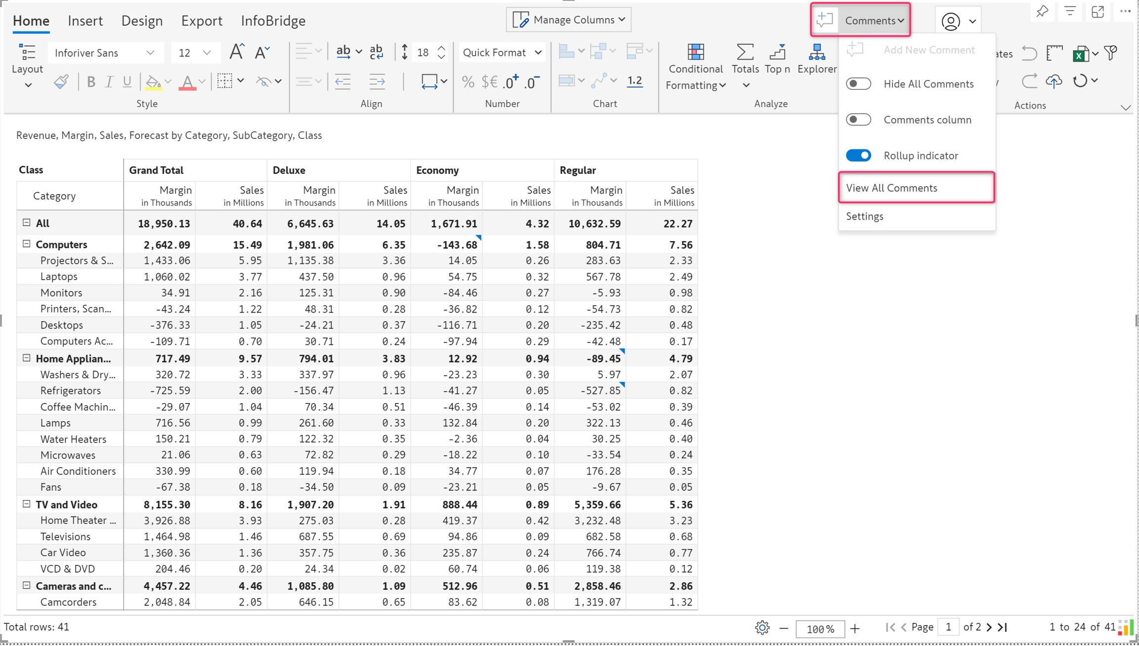 g) Header and cell-level comments are also categorized in the side panel as shown below.