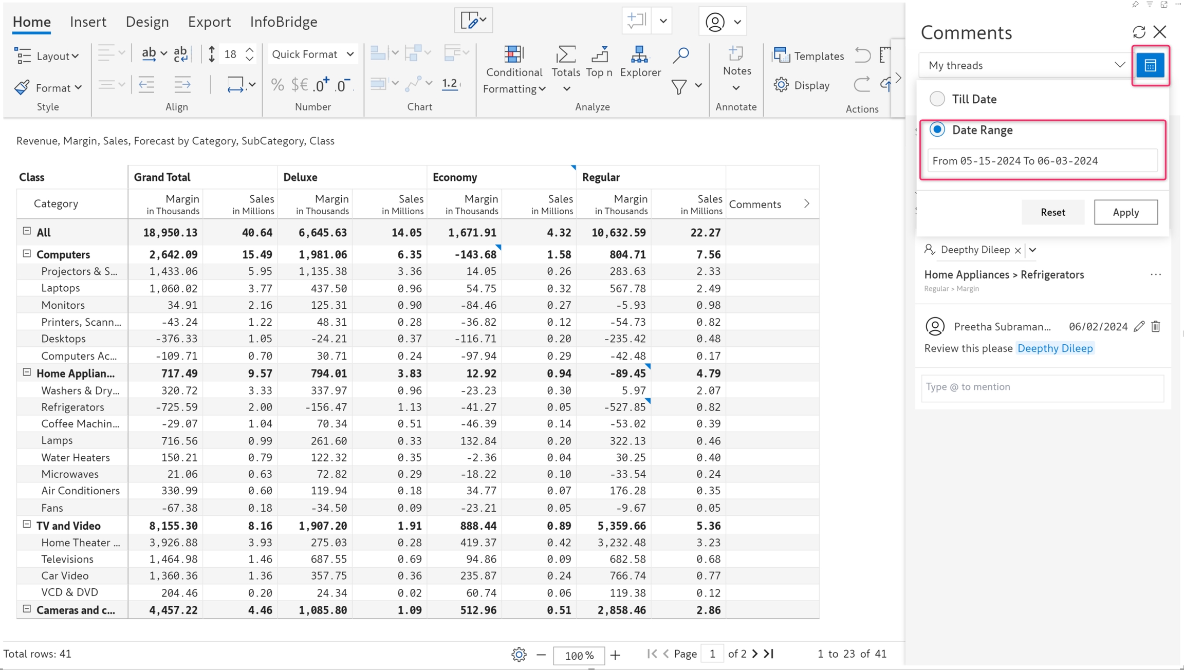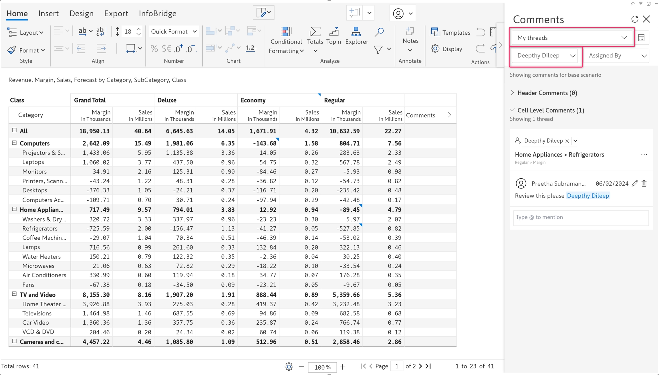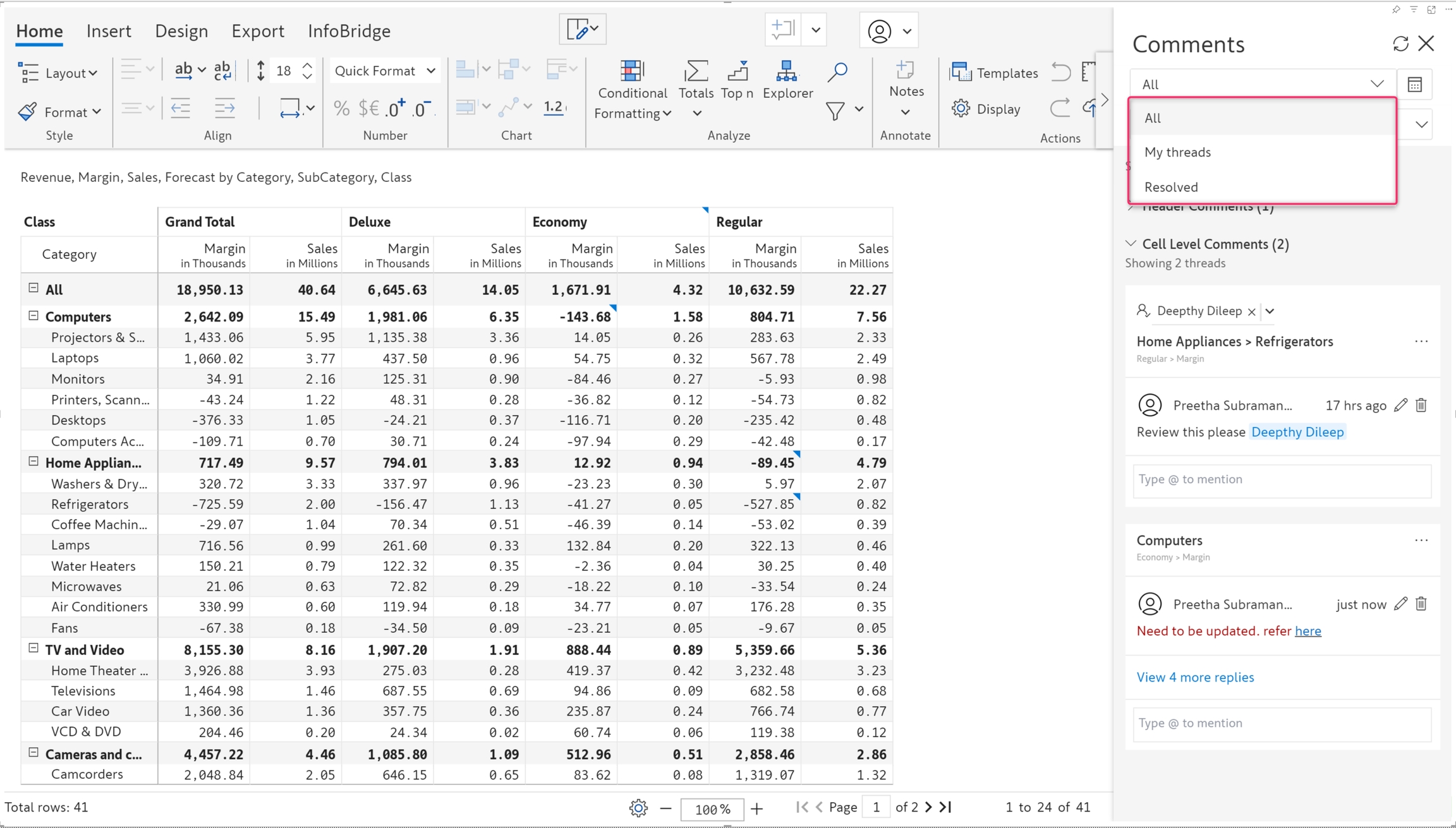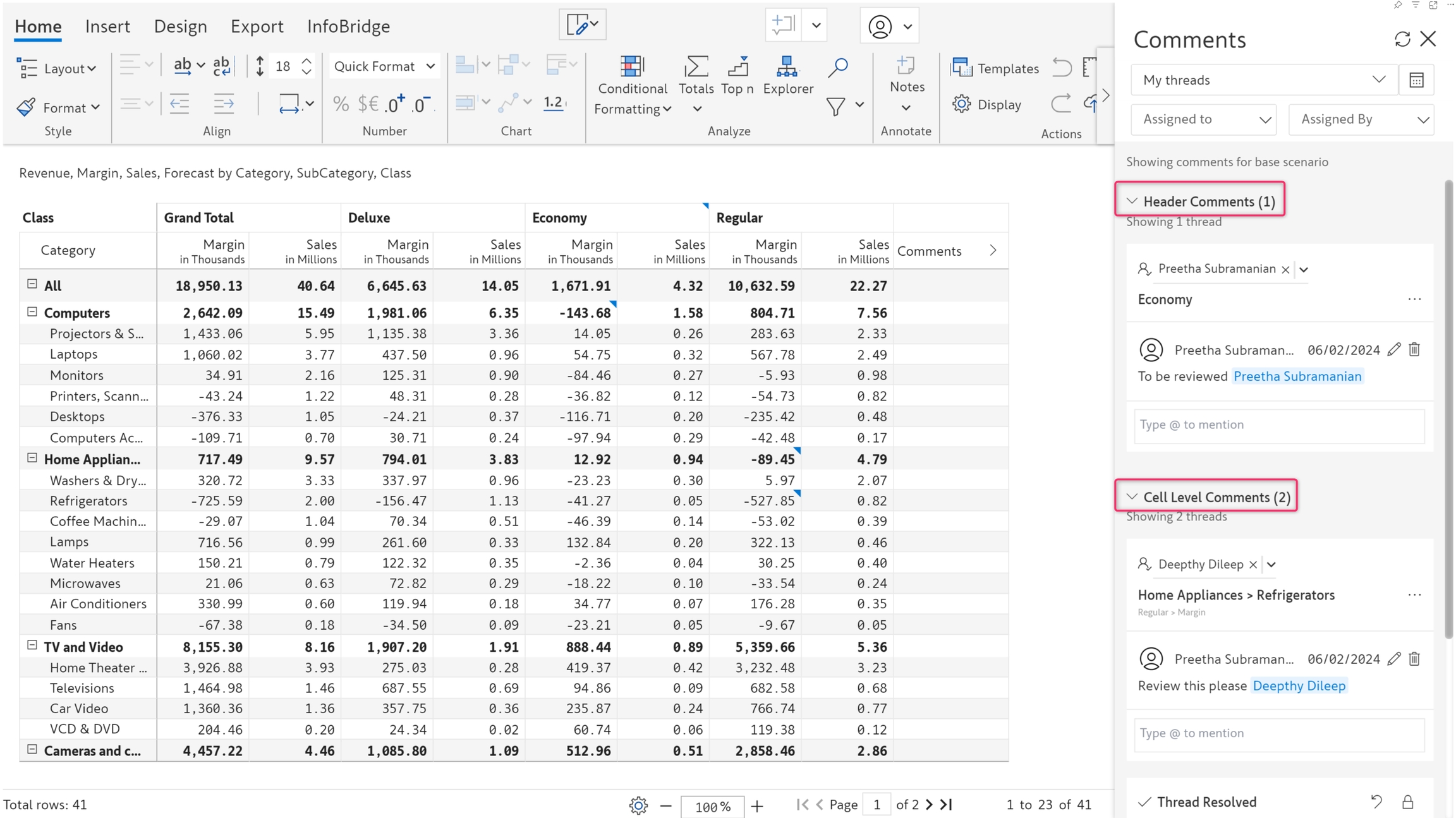 g) Header and cell-level comments are also categorized in the side panel as shown below.