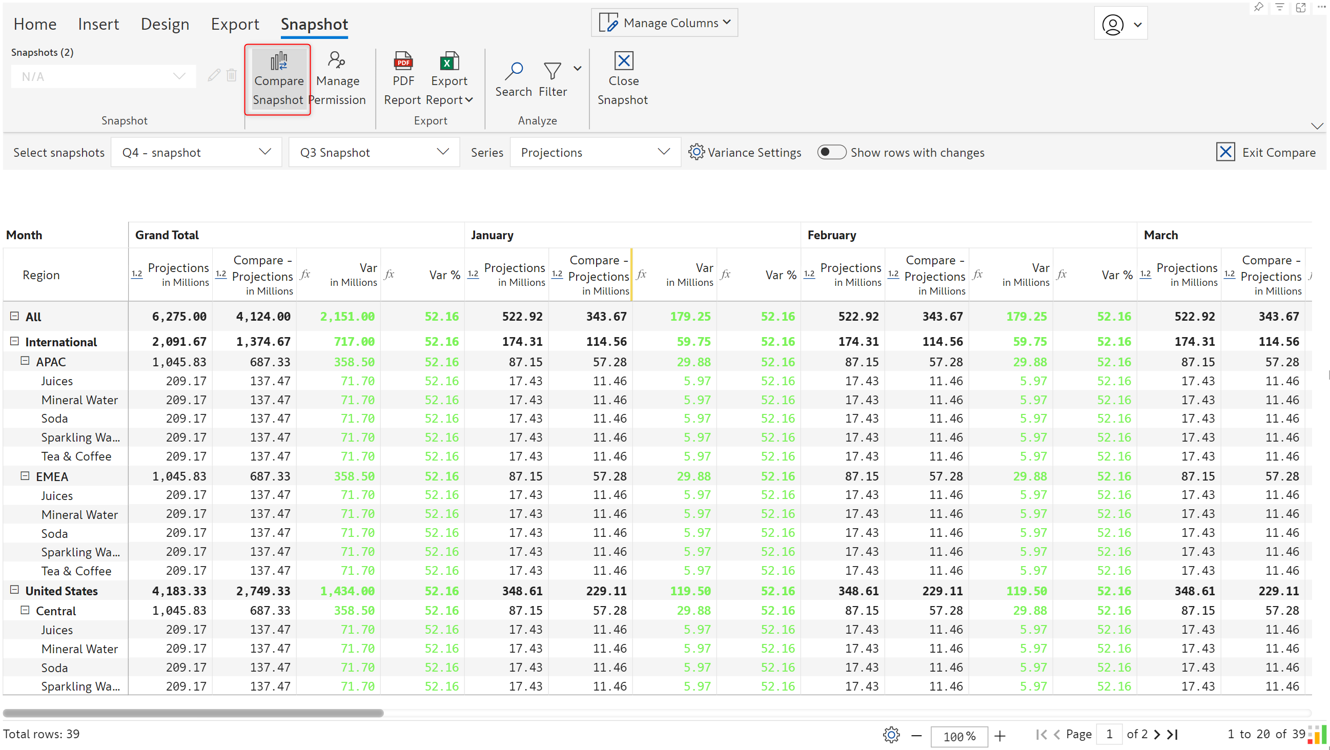 Inforiver allows you to compare snapshots, for instance, you can compare the snapshots taken at the close of each quarter or each year. Inforiver also calculates the absolute and relative variance between the measures in the snapshots.