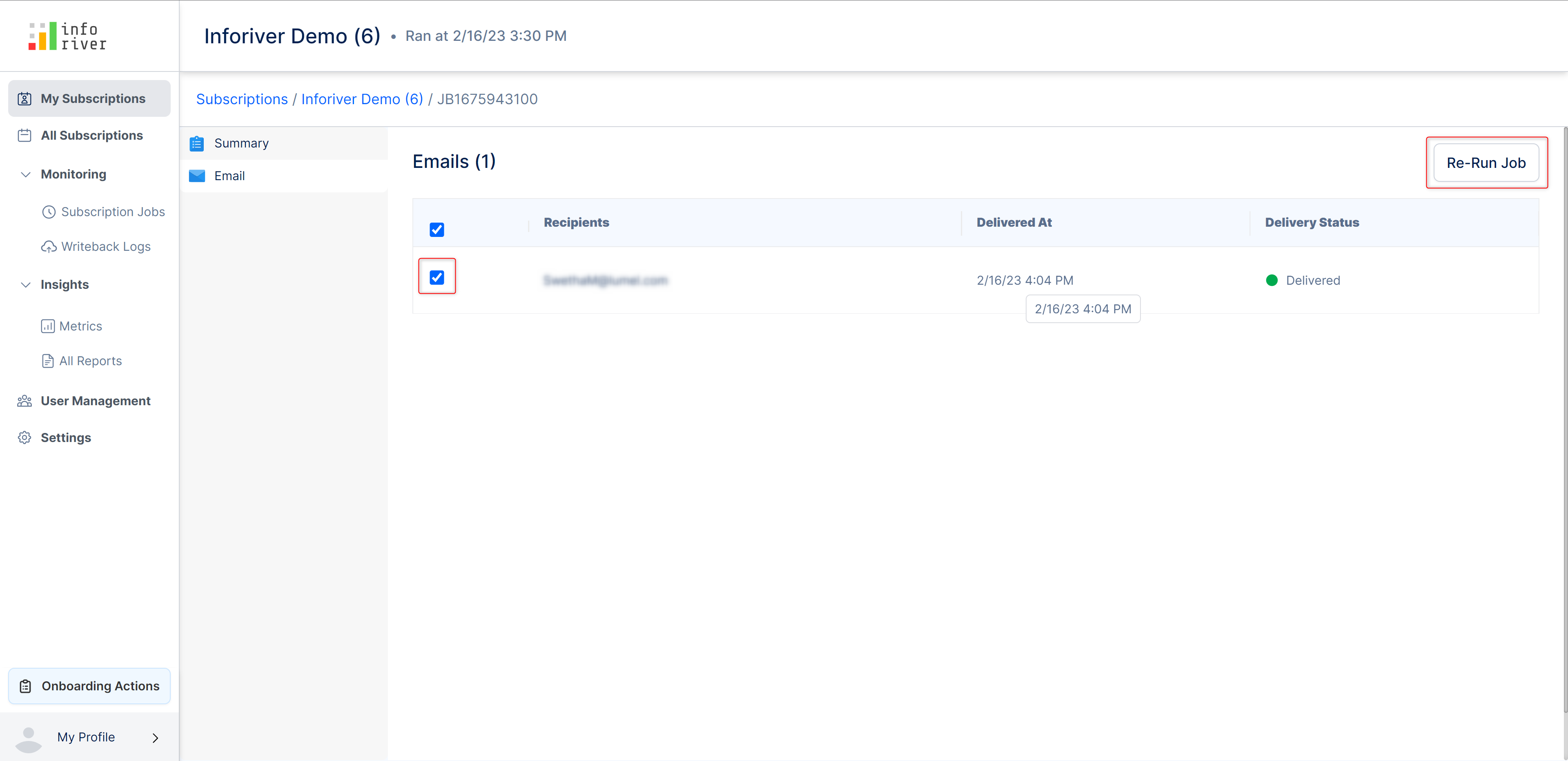 You can also select any of the recipients by enabling the checkbox next to their corresponding email. If any of the checkboxes are enabled, then the 'Re-run job' button becomes available at the top-right corner of the page.&#x20;