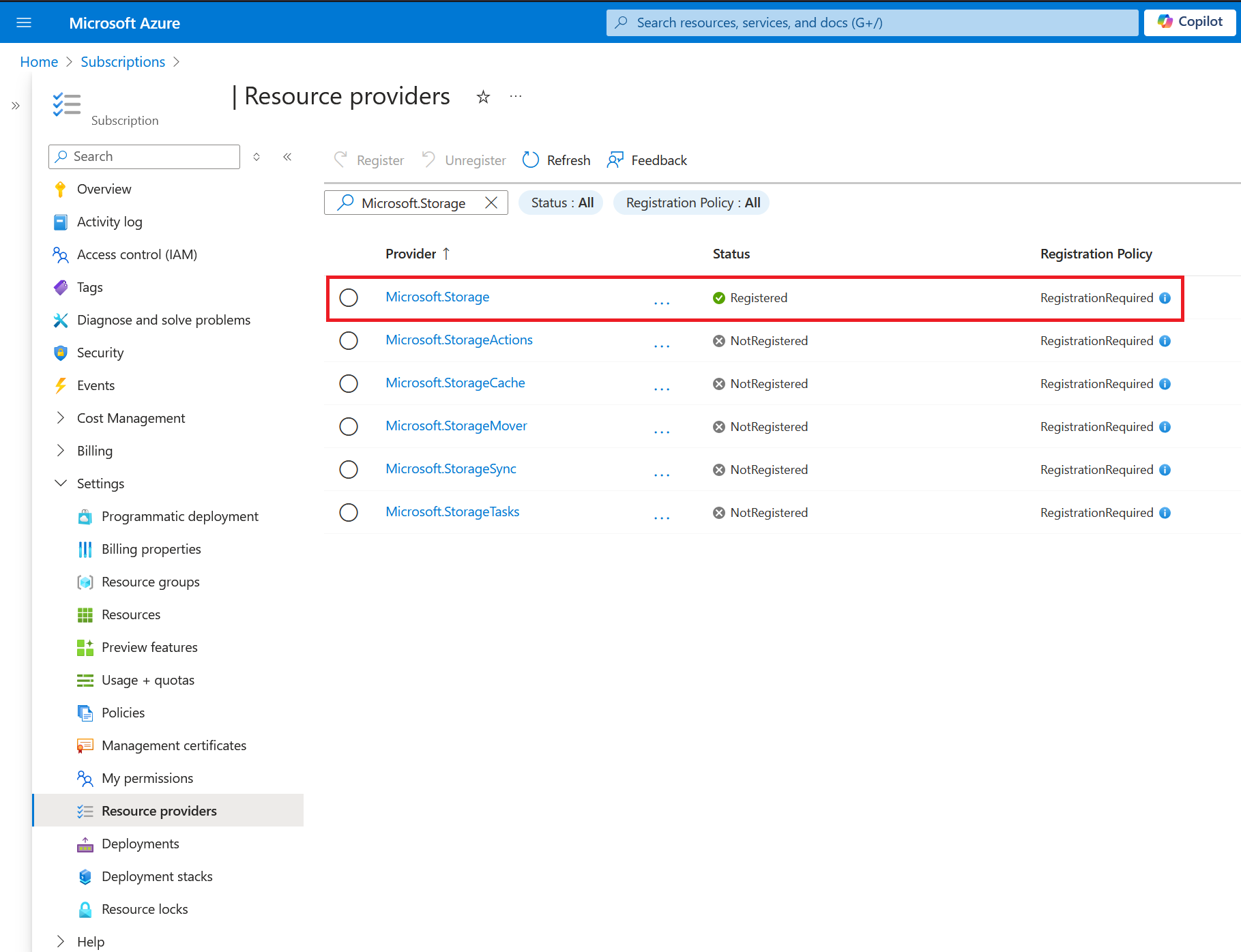 3. Please ensure that the **'Microsoft.DataLakeStore'** and **'Microsoft.Storage'** Resource providers are registered in the Azure subscription.