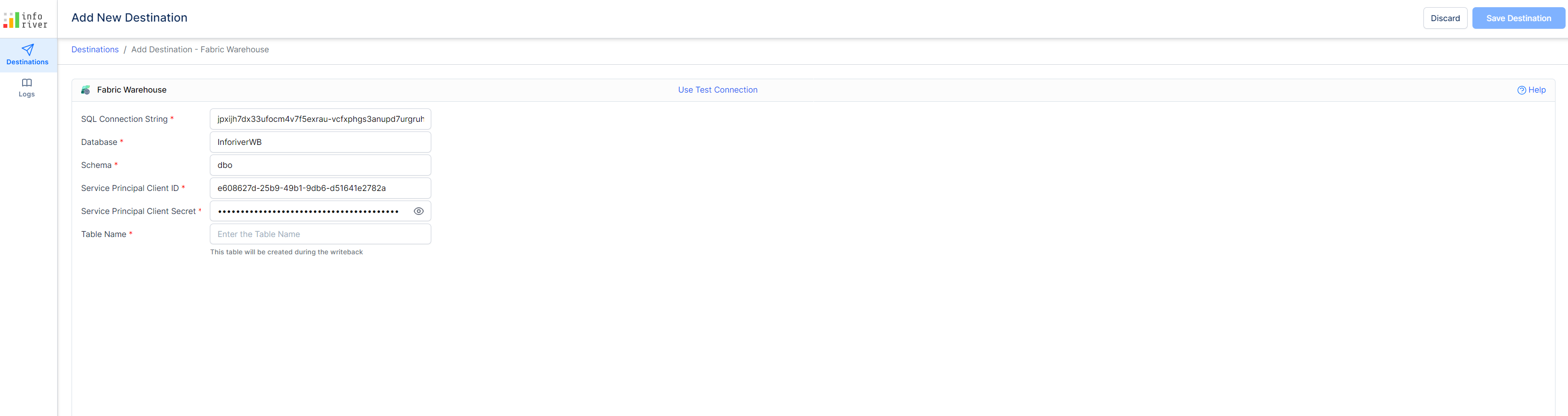 After navigating to the add destination page, the following details are required to add **Fabric Warehouse** as a writeback destination: