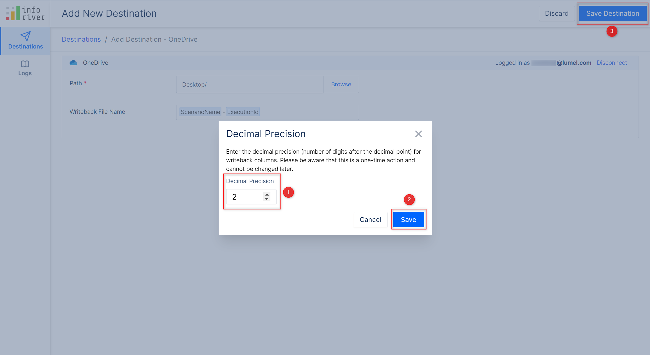 You can specify the number of digits after the decimal point to be written back. This is a **one-time setup** that will apply to **all destinations** configured for a particular report page. While configuring the first writeback destination, you will see a pop-up as shown below, to configure the decimal precision.&#x20;