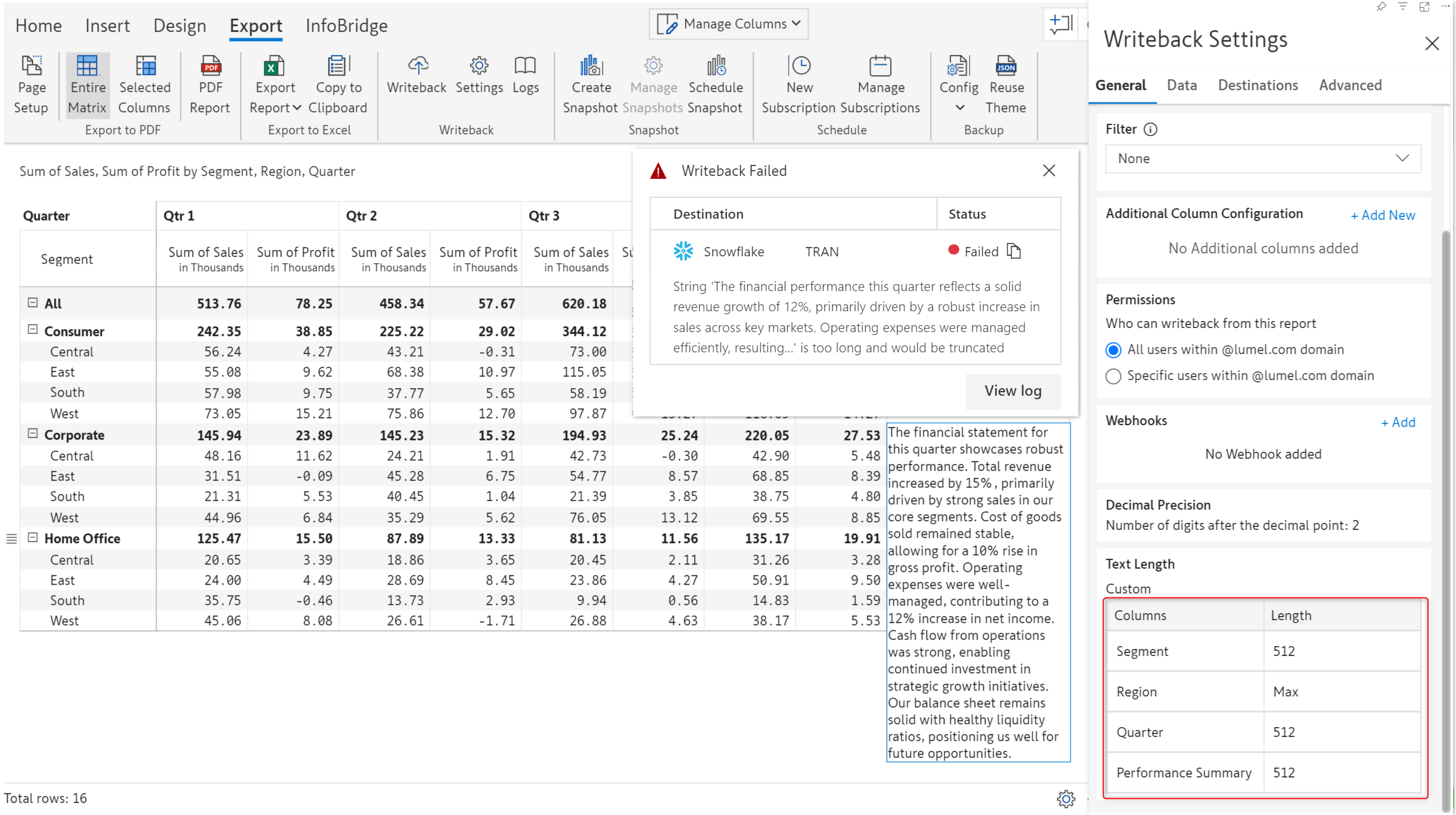 You can restrict the length of text fields to be written back. The default text length allowed in writeback is 512 characters. While adding the first destination, along with [decimal precision](#id-6.-decimal-precision), you can also restrict the length of text fields to 512 characters or allow writeback up to the maximum limit supported by the backend. This is also a **one-time setup** that will apply to **all destinations** configured for a particular report page. [Learn more about configuring writeback destinations here](https://docs.inforiver.com/working-with-inforiver/12.-data-writeback/destinations).