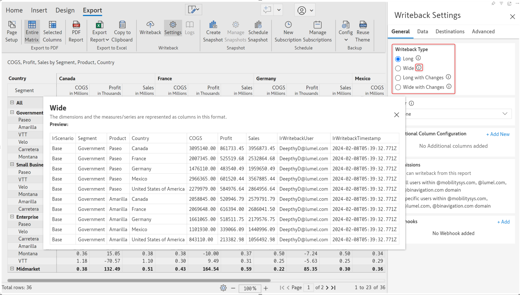 This is the default writeback type for any writeback table. The Tidy (long) type has one row per observation and one column per variable. Please note only the Tidy (long) type supports writing back Inforiver's comments and notes.