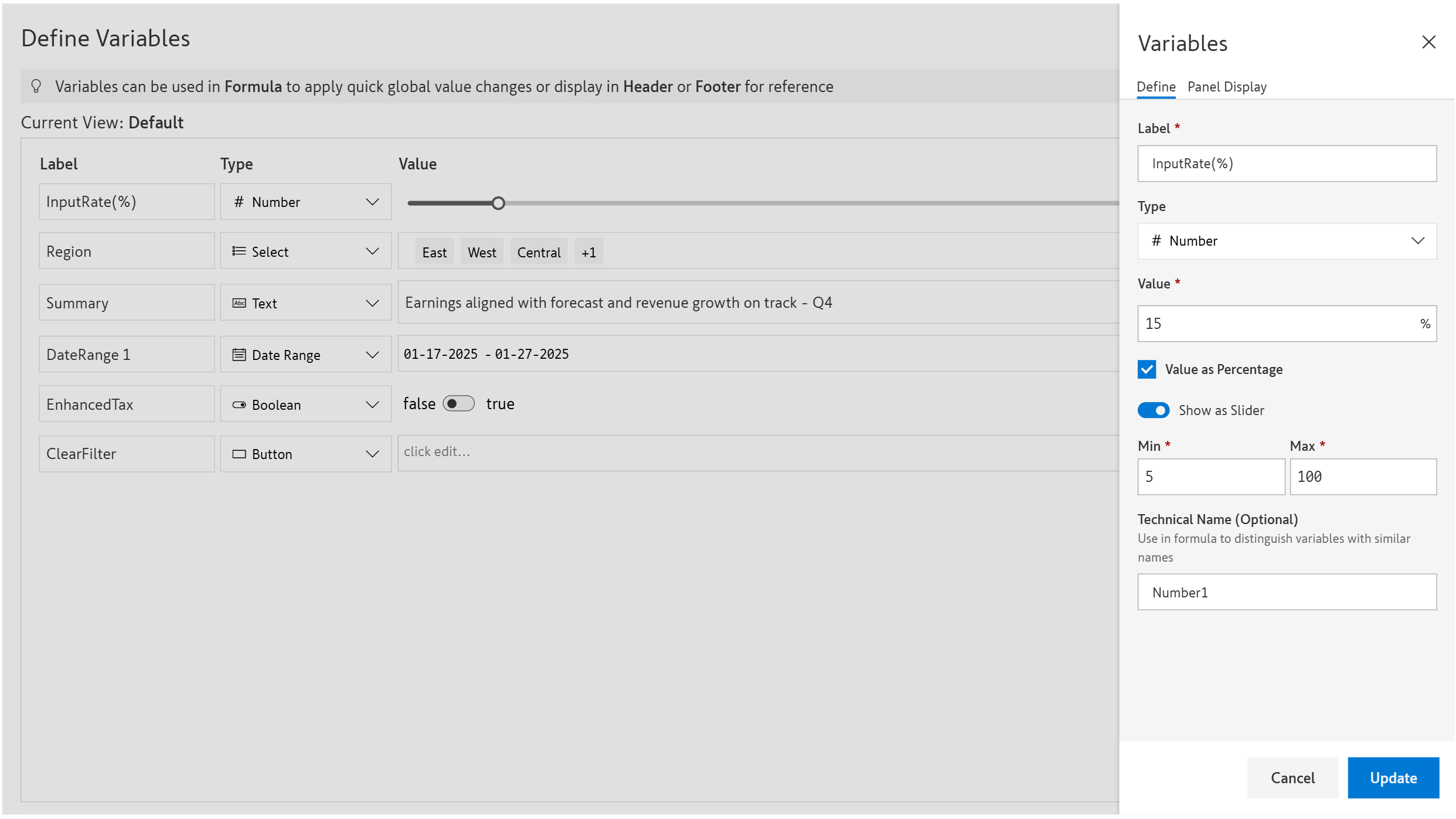 **1.2. Value as percentage:** Enable this option if the variable will be used in calculations involving percentages E.g., calculate a percentage of profits.