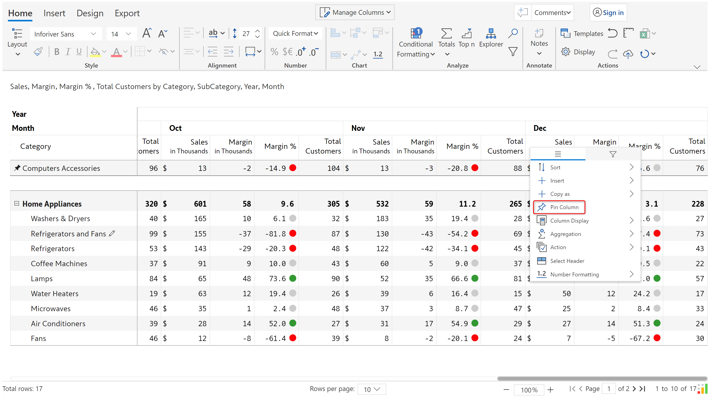 Pinning rows and columns is very helpful when you have too many rows or columns in your report. You can use the pinning option to freeze them respectively at the top or left so that they are visible even when you scroll to another area of the report.