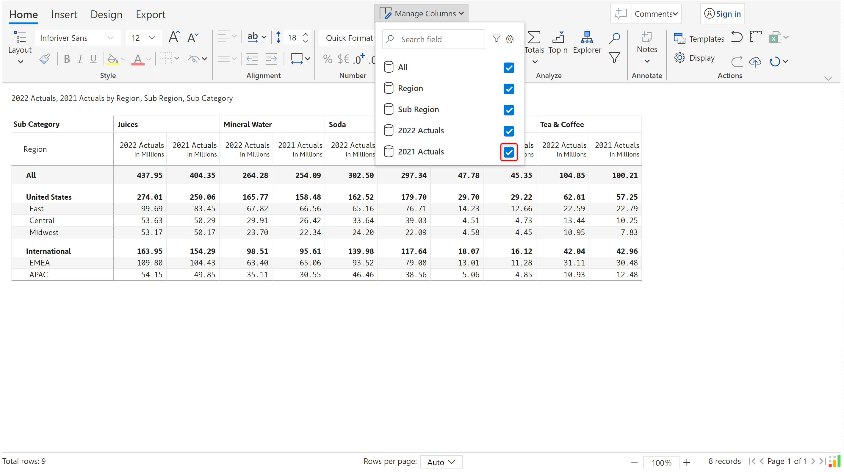 In this example, we have sub-categories in the column field. Let's say you want to hide Juices -> 2021 Actuals alone. This can be achieved using 'Show/hide columns'.
