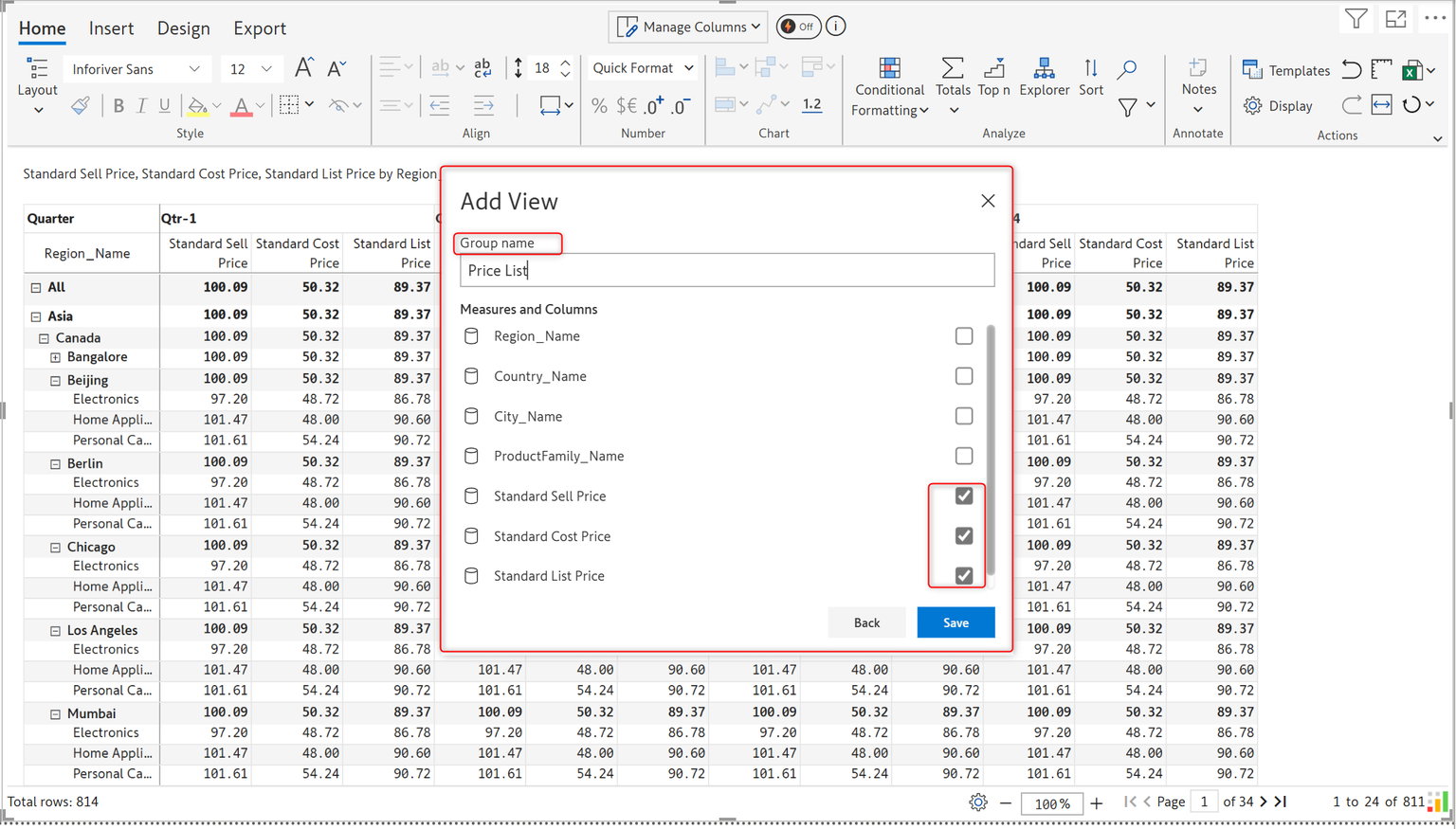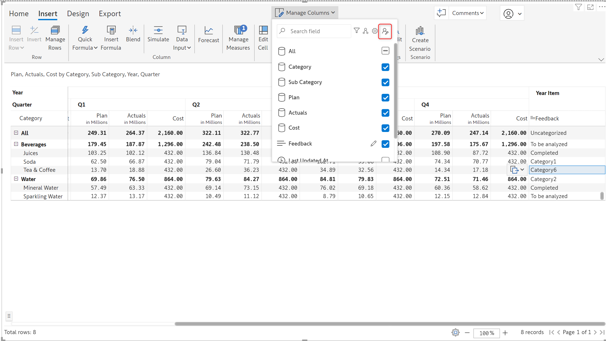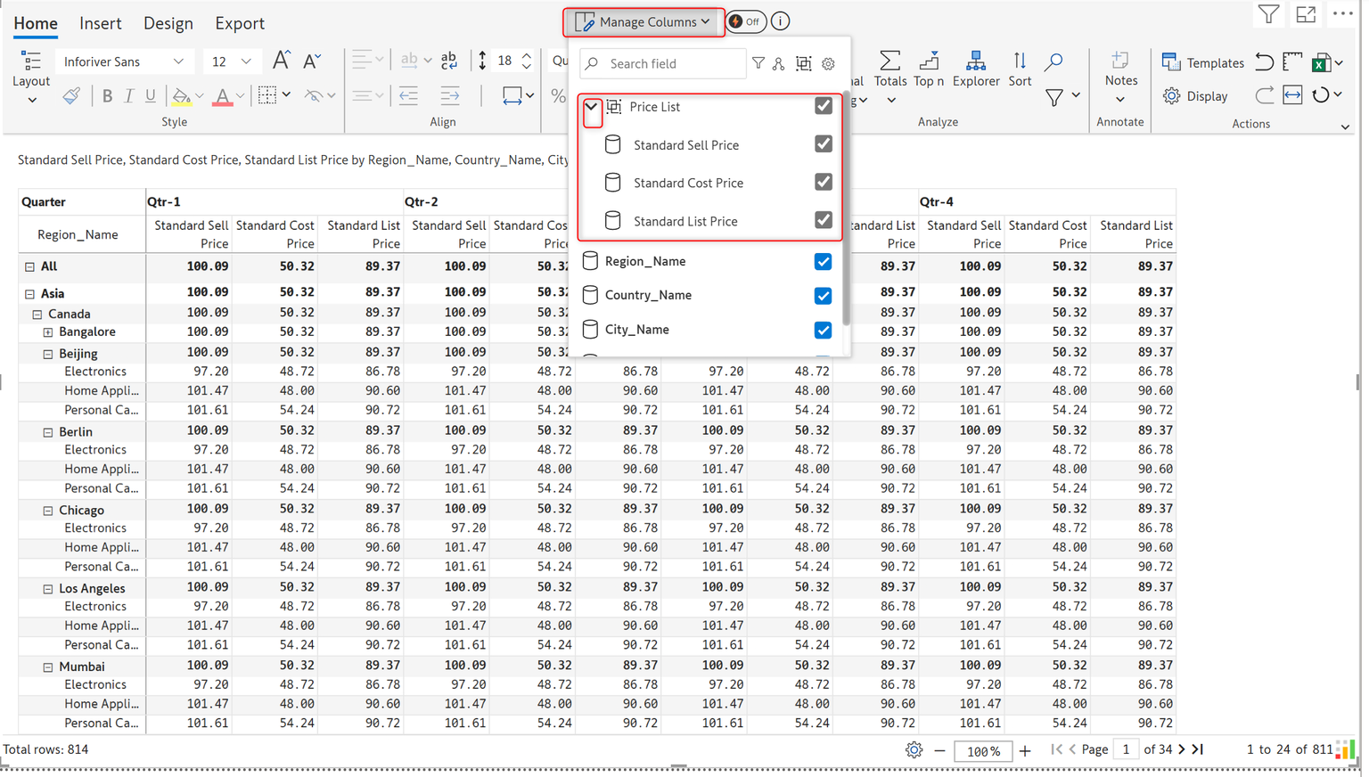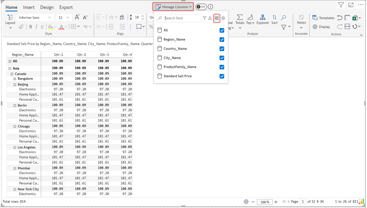 You can now see the Columns being grouped under the group name under Manage columns. Expand the group name to view the measures within.