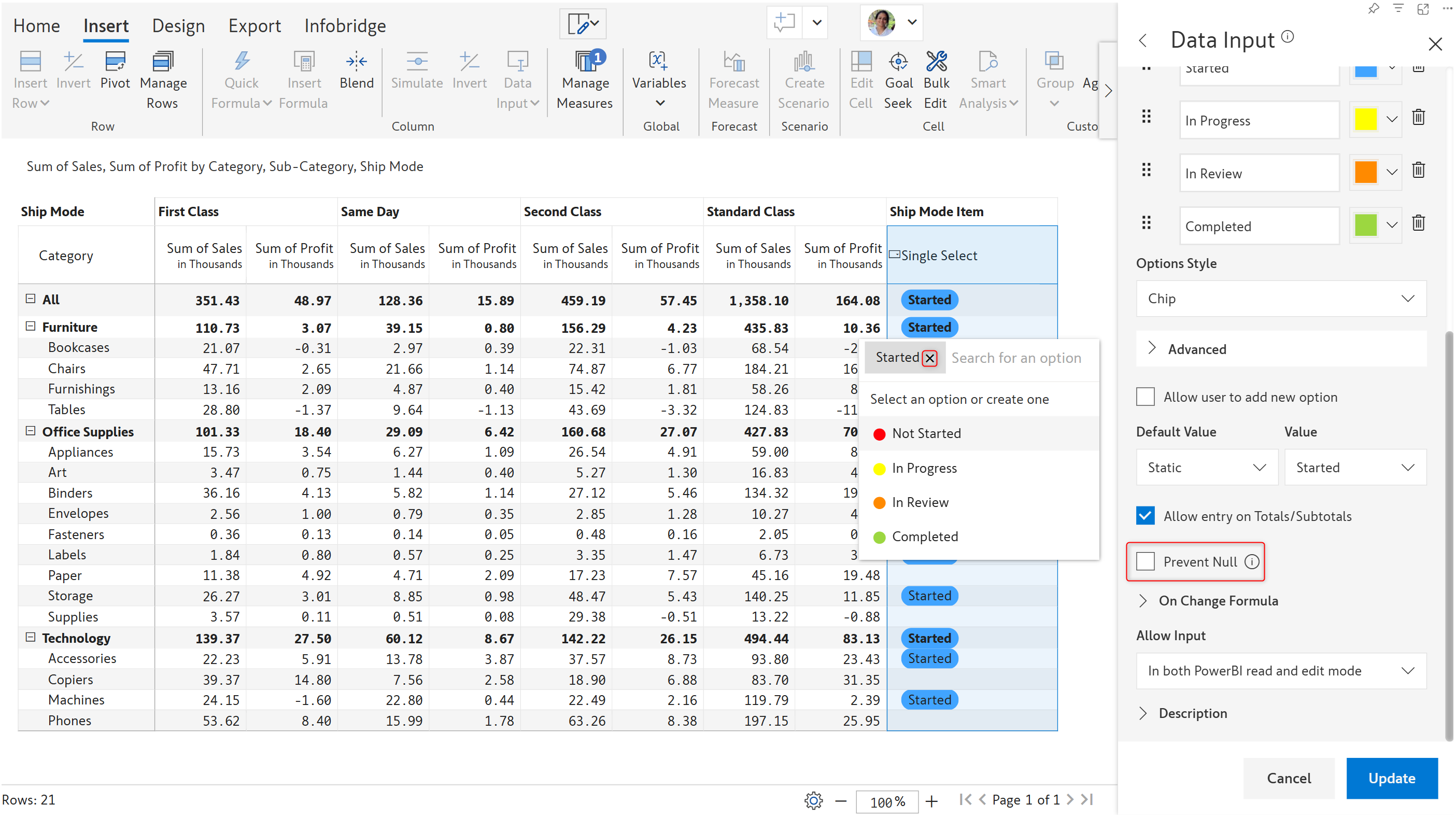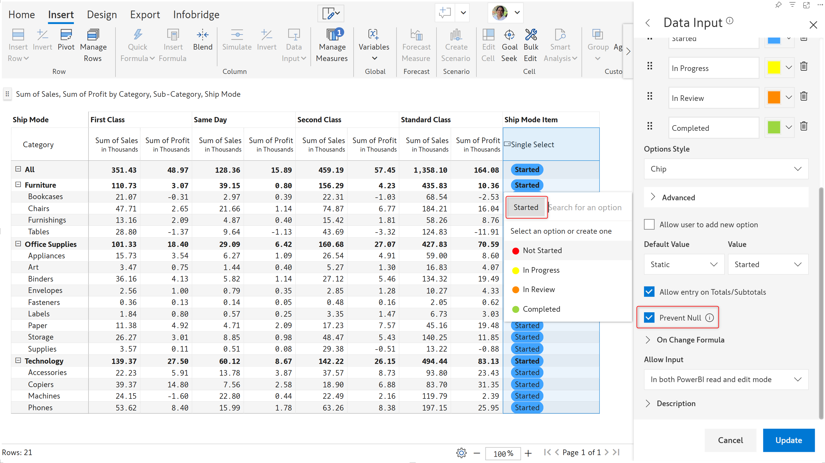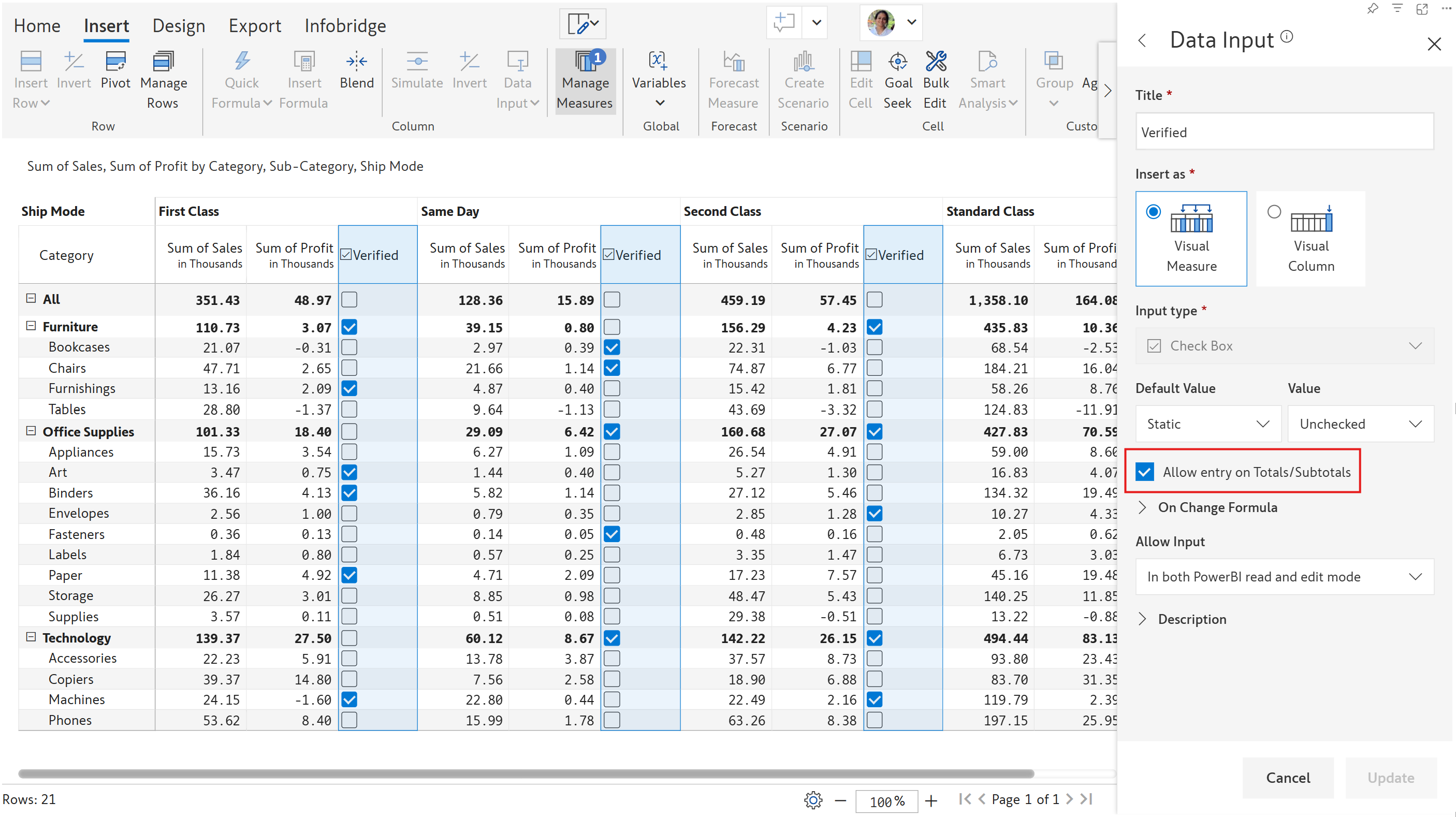 Check this option if data entry can be permitted on parent-level rows in a hierarchy. In this sales report, we are able to make entries for the Grand total, 'Furniture', 'Office Supplies', and 'Technology' rows as the **Allow entry on Totals/Subtotals** option has been enabled.