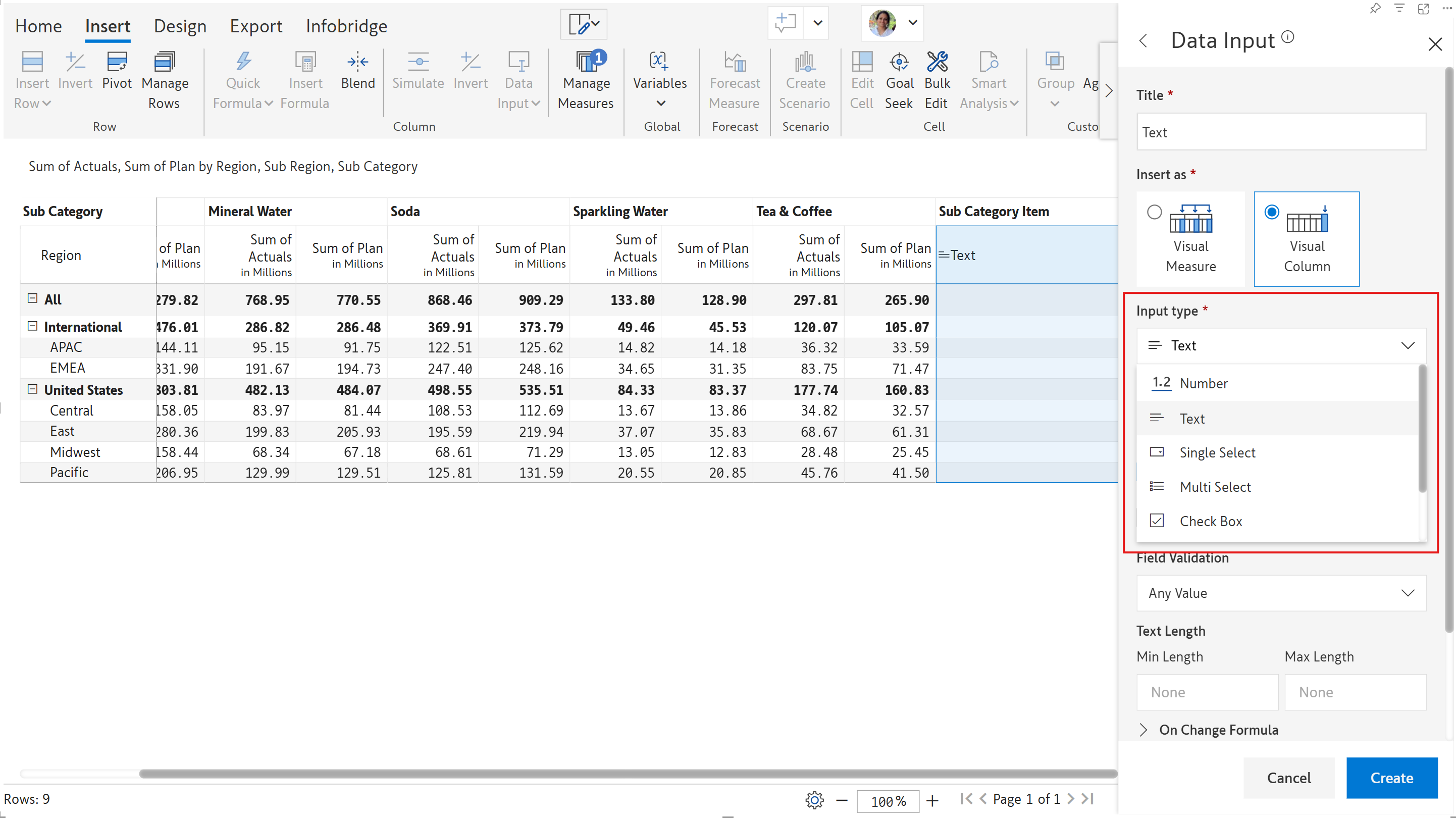 <table><thead><tr><th width="178">Input type</th><th>Description</th></tr></thead><tbody><tr><td><a href="insert-manual-input-columns/insert-manual-input-columns">Number</a></td><td>Double-click and start typing values in directly into a cell</td></tr><tr><td><a href="../../formula-syntax/text-formatting-functions/text">Text</a></td><td>Enter text with multi-line support and word wrap</td></tr><tr><td><a href="insert-manual-input-columns/dropdown">Dropdown</a></td><td>Use the available presets or create your own list of values; supports both single-select and multi-select</td></tr><tr><td><a href="insert-manual-input-columns/text-checkbox-and-date">Date</a></td><td>Add a date from the calendar/date picker</td></tr><tr><td><a href="insert-manual-input-columns/text-checkbox-and-date">Checkbox</a></td><td>Used in case of binary selections</td></tr><tr><td><a href="insert-manual-input-columns/writeback-matrix-features">Person</a></td><td>Input users from your organization (only available in Inforiver Writeback Matrix)</td></tr></tbody></table>