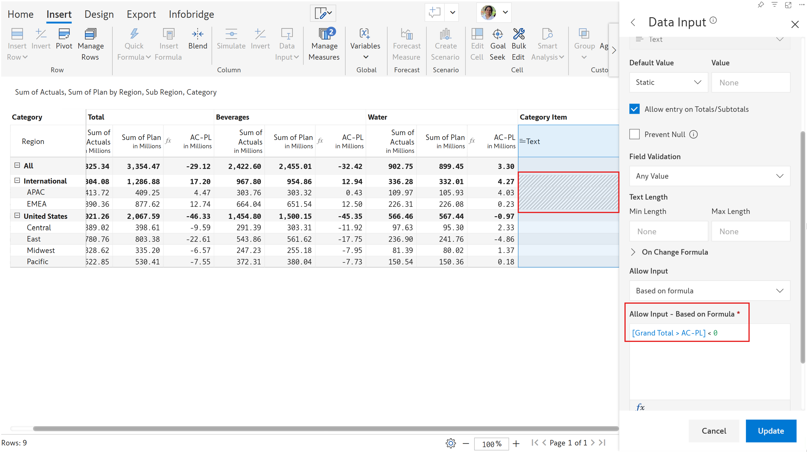 In the image, data input is allowed only if (AC -PL) < 0. You can see that the text fields for 'International', 'APAC', and 'EMEA' are greyed out, and editing is disabled.