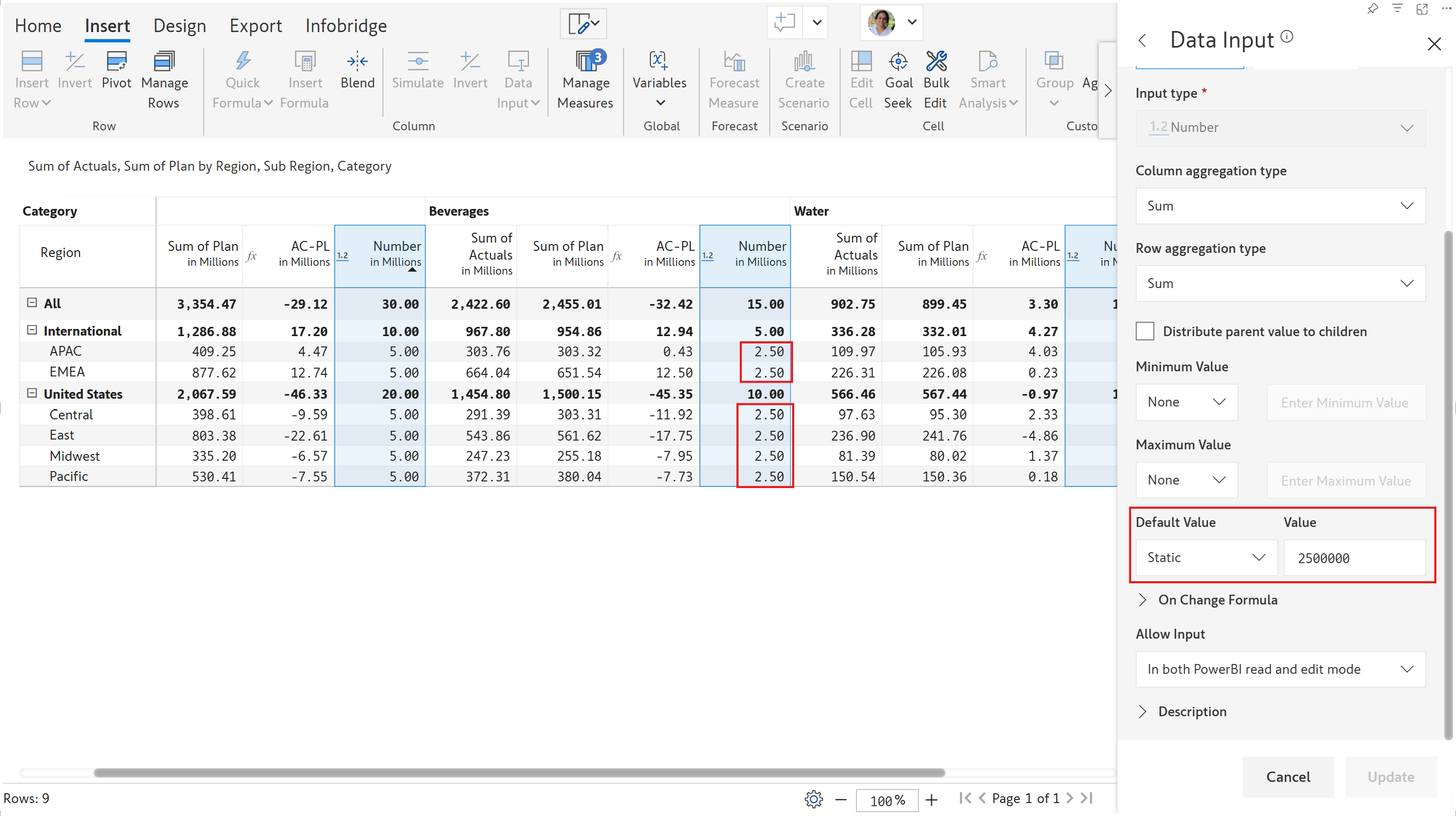 Default values help ensure reports are complete by reducing empty fields, and they also help users understand the type of data that is expected in data input fields. [Learn more about configuring default values.](https://docs.inforiver.com/working-with-inforiver/4.-adding-business-logic-and-formulae/insert-manual-input-columns/default-values)