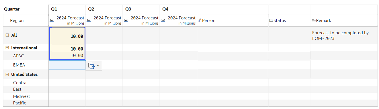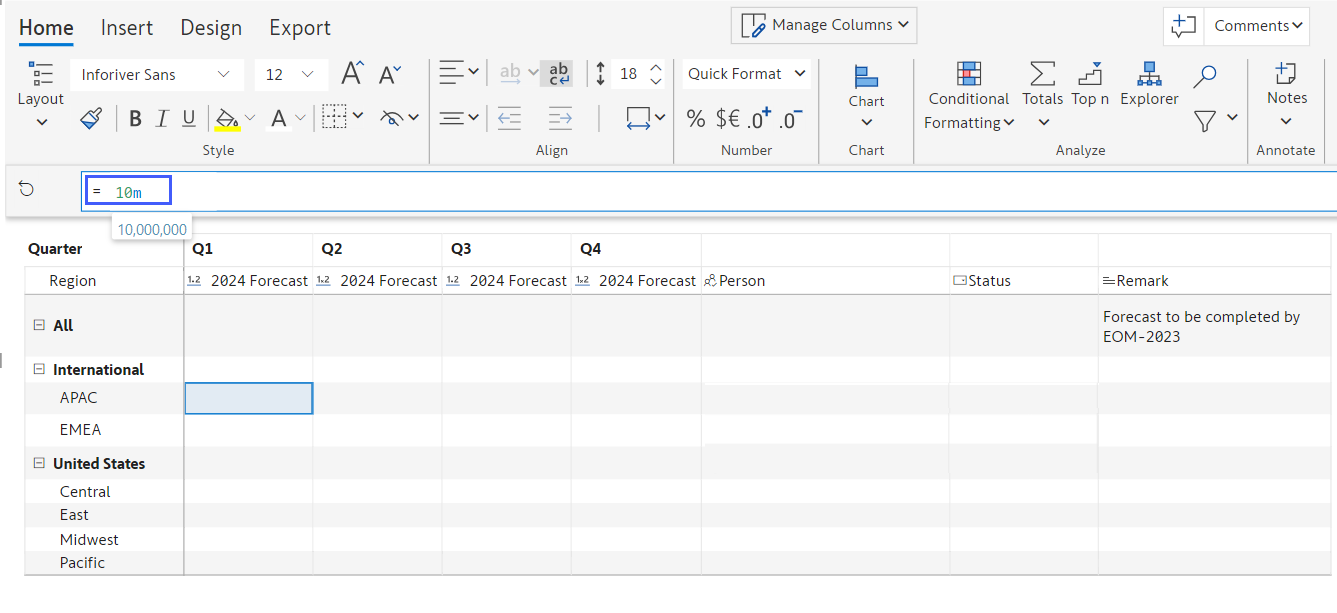 Let us start entering our forecasts now. Double-click the value for Q1 for the APAC region. A formula bar appears above the table. Type in ‘10m’ in the formula bar.