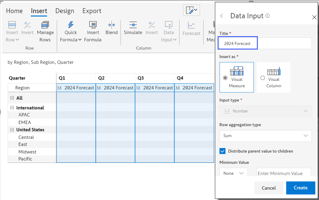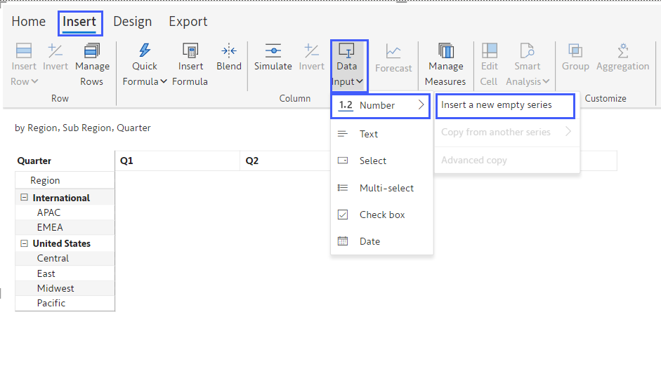 We will now create a data input field (a forecast measure) so that users can type in their values. To do this, click on Insert -> Data Input -> Number (since it is a numeric field type) -> Insert a new empty series.