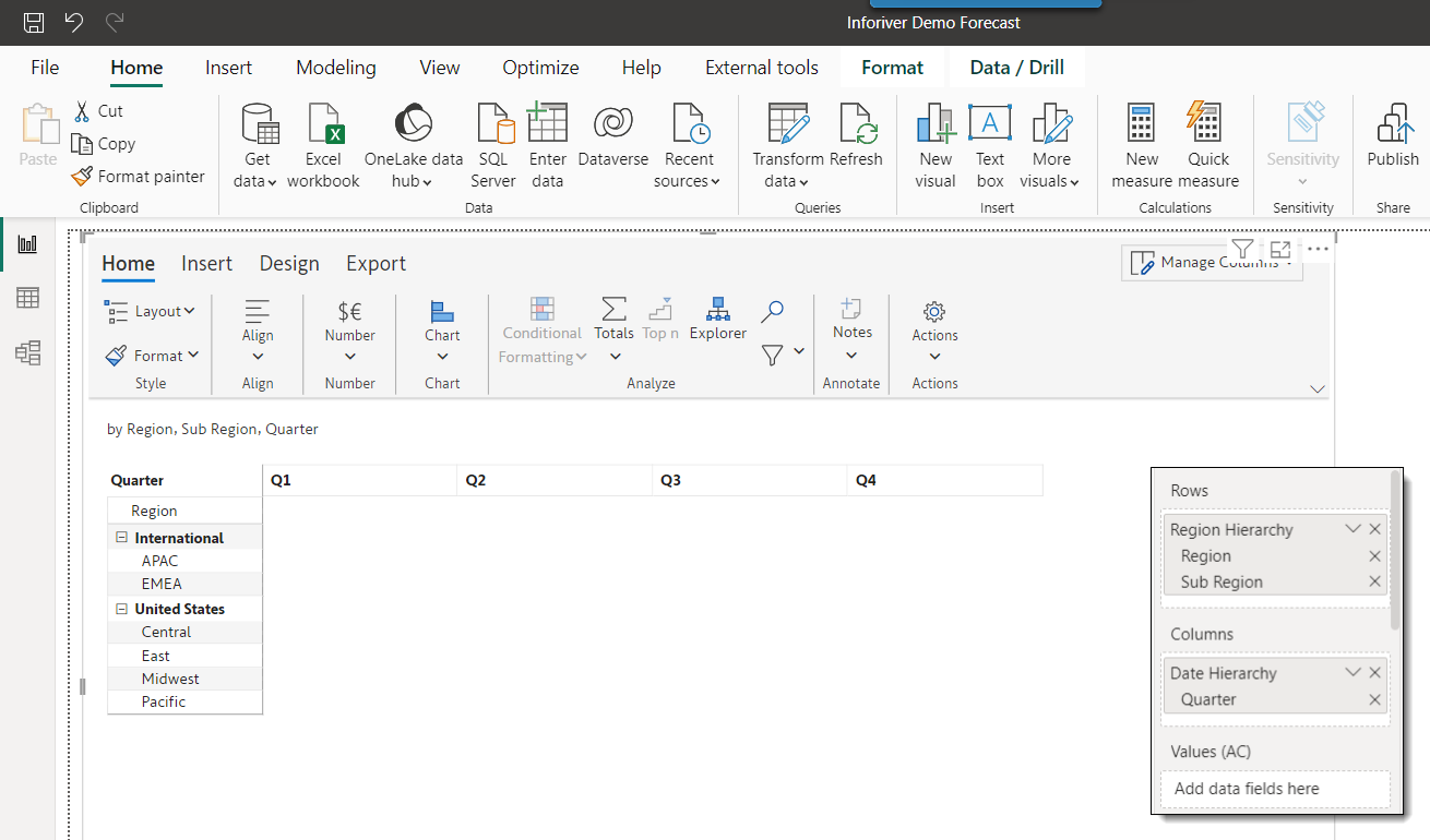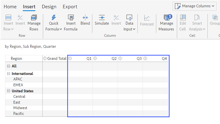 Assign Region & Sub Region categories to rows and Quarters to columns. You will have a blank table structure.