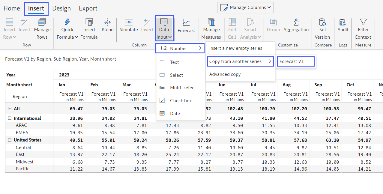 Click on Insert -> Data Input -> Number -> Copy from another series -> Forecast V1, as shown below.