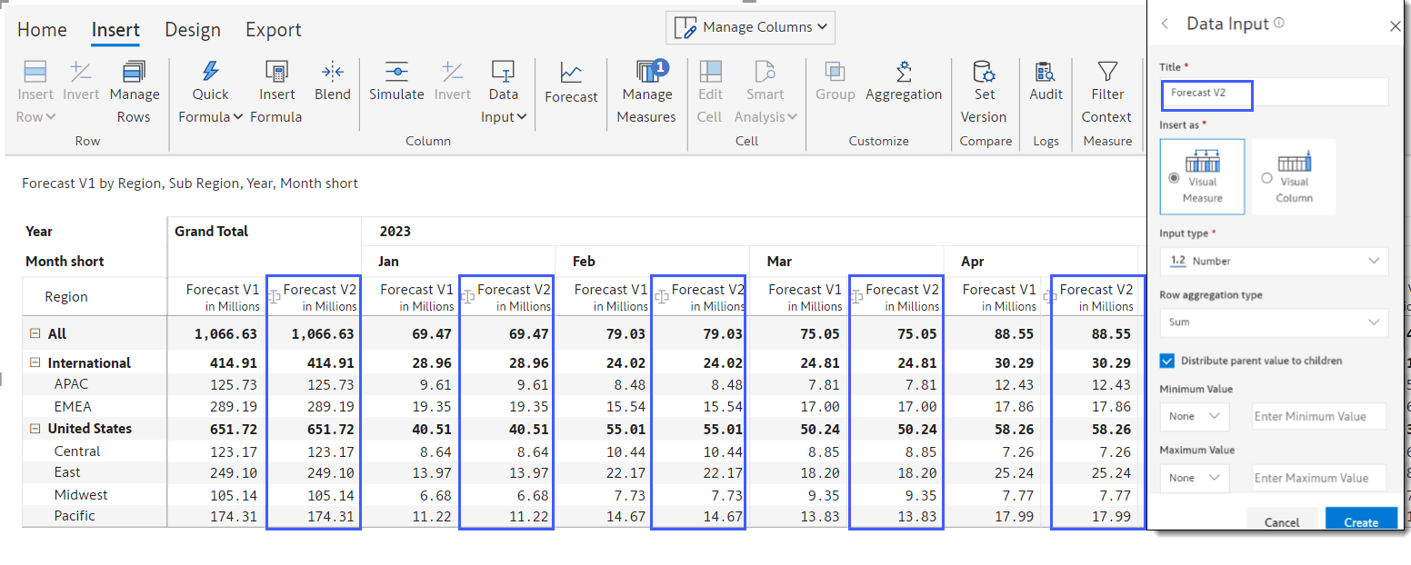 You can start editing the individual cell values. For example, double-click the cell corresponding to Jan Forecast V2 for APAC and then type '11m' in the formula bar that appears above the table.